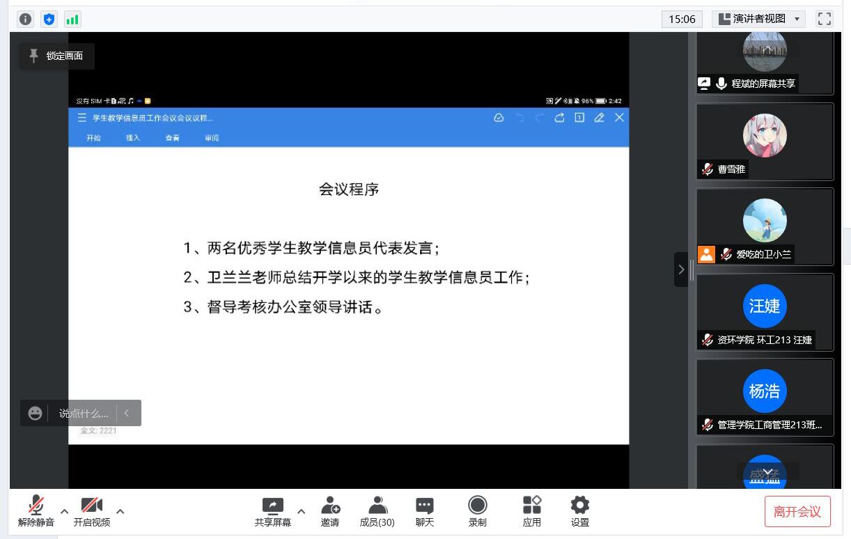为加强教学质量监控及时了解学生对人才培养的基本要求及对各教学环节的意见和建议,充分调动学生民主参与教学工作的积极性和主动性。4月13日下午,我校通过腾讯会议平台召开了学生教学信息员工作会议。学校督导考核办公室主任程斌、副主任王培章、教学督导科马万征老师、综合科卫兰兰老师以及24名学生教学信息员代表参加了会议。会议由王培章主持。