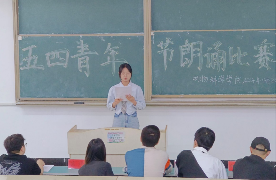 4月24日下午,动物科学学院学生会在求知楼A101举办五四青年节朗诵比赛活动,旨在纪念五四爱国运动,传播和弘扬五四精神,激发我校学生的爱国热情。本次比赛由动物科学学院学生会权益维护部李莹莹主持,食品工程学院学生会主席汪海洋、生命健康与科学学院艺体中心负责人张梦茹等5位学生会负责人担任本次比赛评委。