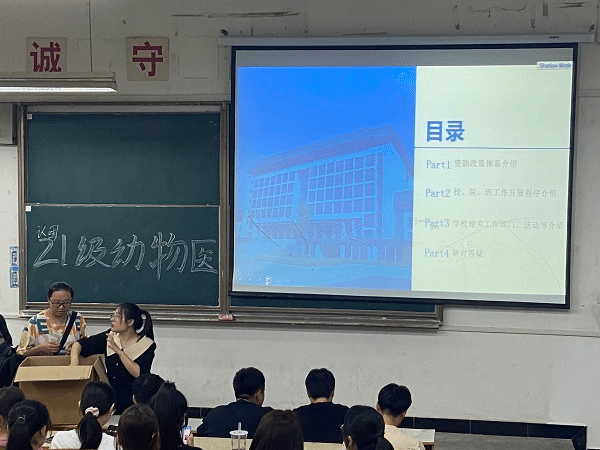 为使新生对校资助政策体系有系统而全面的了解,9月17日下午,动物科学学院于求a105教室召开“资助政策,伴我成长,助我成才”主题班会,班会由辅导员胡文丽主讲。