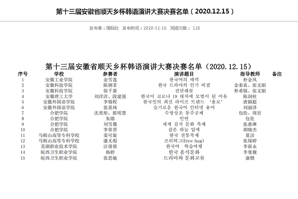 为深入学习习近平新时代中国特色社会主义思想和党的十九大精神,全面贯彻落实全国教育大会和新时代教育对外开放工作会议精神和要求,进一步提升我省高校大学生的韩语交流水平,由安徽省教育厅组织,合肥学院和韩国顺天乡大学共同举办的“第十三届安徽省‘顺天乡’杯韩国语演讲大赛”于2020年12月落下帷幕。