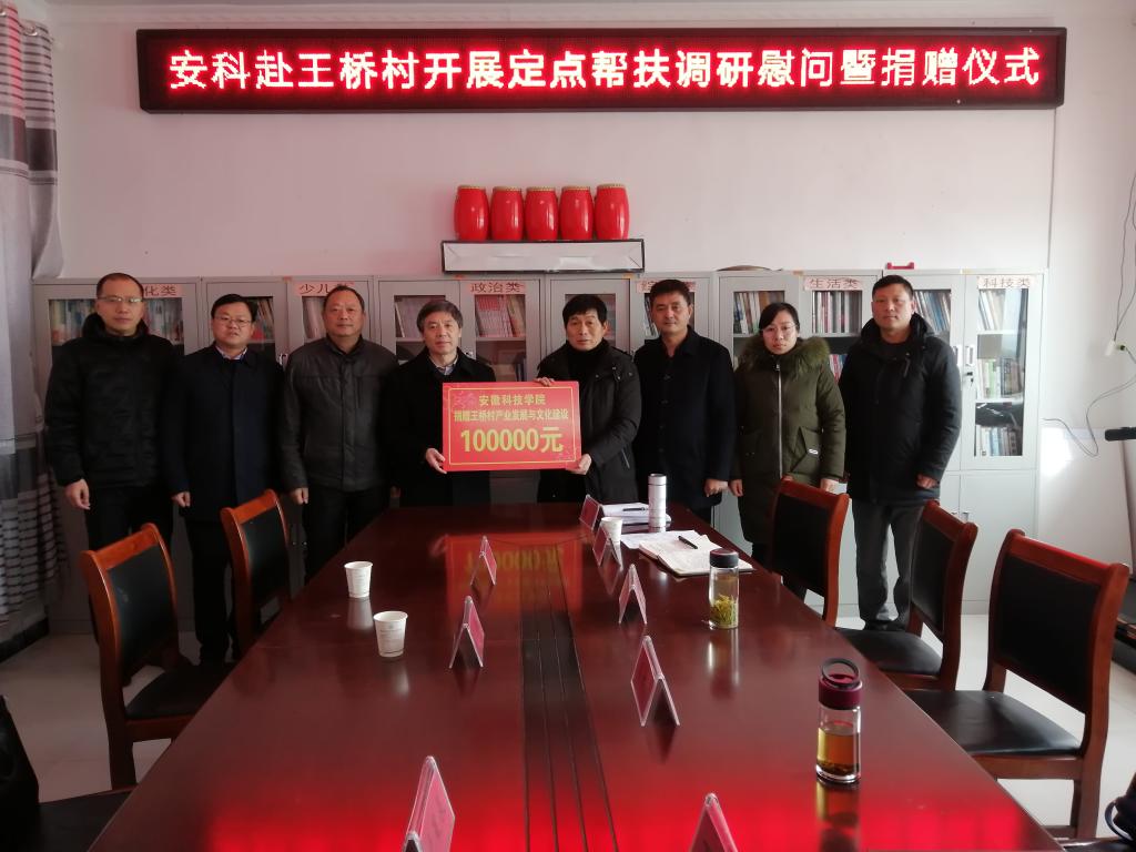 在新春佳节即将到来之际,1月17日,党委书记蒋德勤在科研处处长顾有方、党委组织部副部长、党委(校长)办公室副主任卢星辰的陪同下,来到我校定点帮扶单位——涡阳县西阳镇王桥村实地调研指导精准扶贫工作,并亲切慰问我校驻村扶贫工作队丁景良、张海亮、余维发三位同志及当地困难群众。涡阳县扶贫开发局副局长姜林林、涡阳县西阳镇党委书记栗克、西阳镇党委委员韩伟、西阳镇王桥村第一书记兼驻村扶贫工作队队长丁景良、西阳镇王桥村党委书记王杰等陪同调研和慰问。