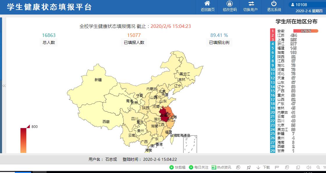 搭平台,开发学生健康状态填报采集平台。1月30日在采用传统Excel摸排掌握学生身体状况、位置信息等基本情况的基础上,及时联系学工系统技术开发商,商议开发防控疫情填报信息平台,经过众望升腾科技有限公司技术人员的加班加点工作,我校学生健康状态填报平台于2月1日正式部署上线,2月2日开始采集学生身体健康状况、当前所在位置等信息,目前已采集11万余条学生填报信息。系统的使用,全面、及时、准确、有效摸排学生疫情信息,及时掌握学生健康信息和位置变化情况,为打赢疫情防控阻击战提供科学参考。通过系统填报缩短了疫情报送时间,与病魔拼速度,提升了数据报送的及时性和准确性,提高了工作效率,为坚决遏制疫情蔓延势头,坚决打赢疫情防控阻击战提供了有力保障。