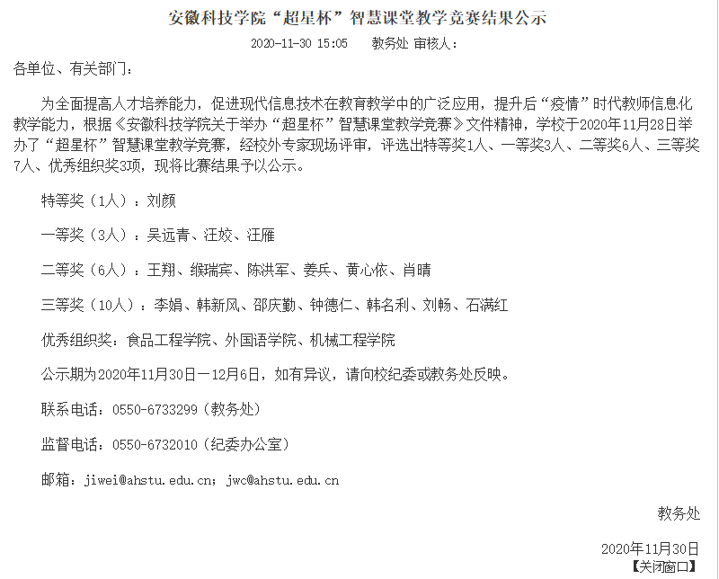 在学校举办的“超星杯”智慧课堂竞赛中,刘颜老师获特等奖、汪姣老师获一等奖。刘颜、汪姣等青年教师在课堂把握能力、课程思政水平上的进步,受到师生好评。