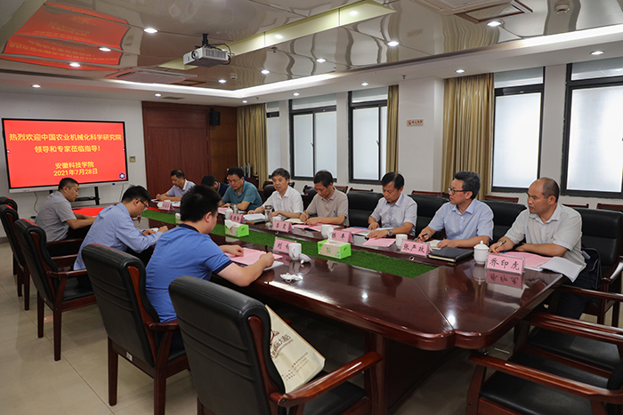 2021年7月27日至28日,中国农业机械化科学研究院副院长苑严伟,率党委组织部副部长、研究生院招生与就业办公室主任刘涛和战略运营部产业经营办公室主任刘铎,应邀来我校考察指导工作、洽谈合作交流项目。党委书记蒋德勤,党委副书记、校长李震,党委委员、副校长黄友锐,党委研究生工作部部长、研究生处处长张春雨,科研处副处长张从宇,机械工程学院党委书记、院长陈丰,组织员张严政,副院长乔印虎参加洽谈交流会。