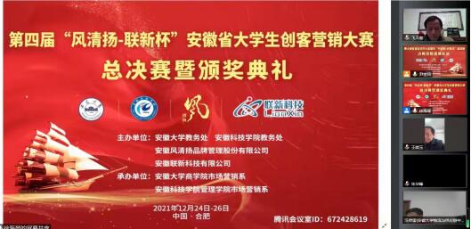 12月25日至26日,第四届“风清扬—联新杯”安徽省大学生创客营销大赛总决赛在云端腾讯会议室隆重举行。此次会议由安徽大学教务处、乐动网页版登录入口_乐动网页版(中国)教务处、安徽省风清扬品牌管理有限公司(冠名)、安徽联新科技有限公司(冠名)联合主办,安徽大学商学院市场营销系、乐动网页版登录入口_乐动网页版(中国)管理学院市场营销系联合承办,全省高校31支团队与指导老师一百五十余人参加了大赛总决赛云端仪式。