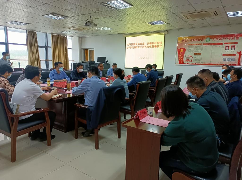 为积极探索师范生教育实践工作,建立高校、地方教育行政部门和基础教育学校权责明晰、稳定协调、合作共赢的“三位一体”师范生协同培养机制,构建教师培养、培训、研究和服务一体化的合作共同体,推动我校师范类专业认证工作,4月12日下午,乐动网页版登录入口_乐动网页版(中国)与凤阳县教育体育局协同培养师范生合作协议签署仪式在凤阳县教育体育局三楼会议室隆重举行。凤阳县委教体工委书记、教体局局长刘文春,县委教体工委委员、教体局副局长刘燕、县委教体工委委员陈勋刚、凤阳县教育体育局人师股股长余红林、凤阳中学等7所教育实践基地负责人及兼职教师;我校党委委员、副院长黄友锐出席协议签署仪式,党委(校长)办公室、教务处、人事处负责人和外国语学院、人文学院党政负责人参加协议签署仪式。签约仪式由我校党委(院长)办公室主任曾献功主持。