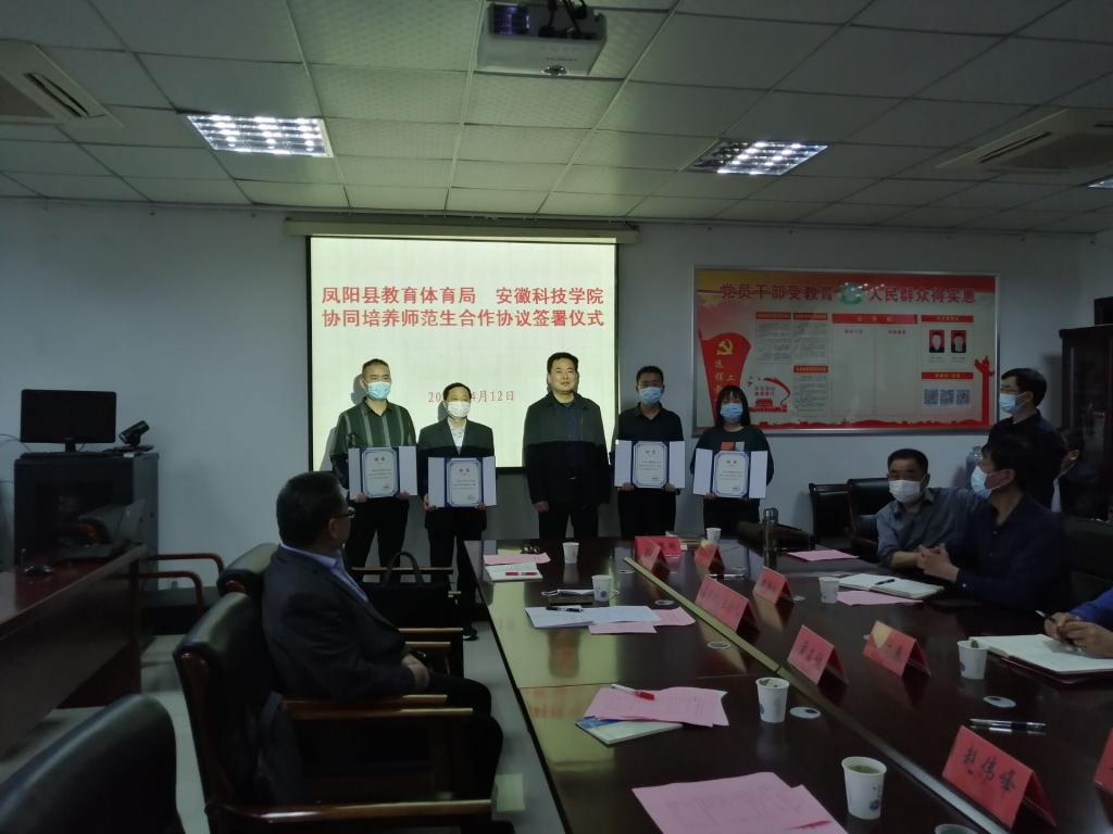 在热烈的掌声中,刘文春、赵伟峰、凤阳中学校长陈勋刚、凤阳二中校长高怀彬、凤阳三中校长徐维兵、凤阳县实验中学校长杨克军、凤阳县崇文中学校长宋夕奎、凤阳县朝阳中学校长张祖传、凤阳县阳光学校校长吴世云分别代表地方教育行政部门、高校、教育实践基地签订了《“三位一体”协同培养师范生合作协议》。随后,黄友锐向兼职教师颁发聘书。