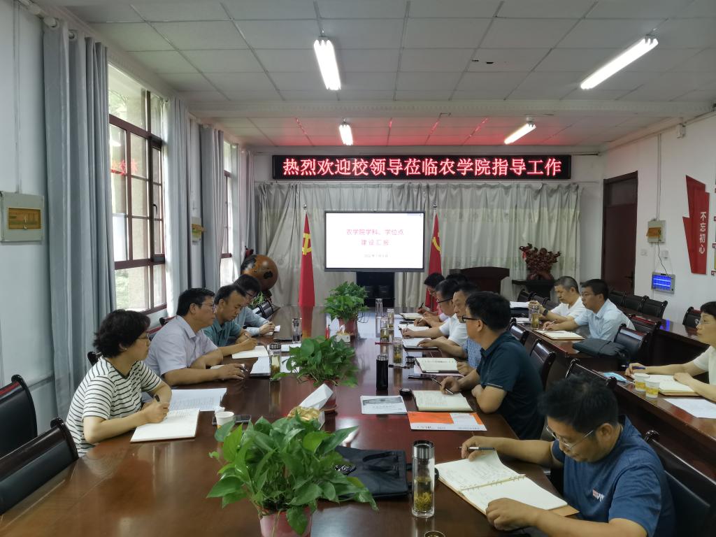 农学院党委委员、副院长李文阳从学科基本情况、一级学科建设情况、拟重点建设学科、拟重点建设学科发力点及突破思路、学科建设面临的主要问题以及学位点建设等六个方面详细汇报了农学院学科及学位点建设状况,并梳理了下一步的工作思路和举措。与会教师分别就学科方向凝练、人才队伍、存在问题、建设措施等积极发言献策。农学院党委书记何世潮和党委副书记、院长崔广荣对校领导一行来农学院指导工作表示感谢,并就下一步工作推进计划做了简要介绍。他们表示,全院教职工在校党委和行政的坚强领导下,进一步统一思想,凝心聚力,端正态度,积极作为,紧紧抓住学科建设这个龙头,以师资队伍建设、团队整合、学科平台建设、项目申报为抓手,进一步凝练好学科建设方向,突出学院特色和优势,积极推进省级重点实验室等平台的申报和建设工作,高质量完成学科建设和学位点建设任务,为学校“三步走”战略的顺利实施作出应有的贡献。(特约通讯员:汪道兵 审核:崔广荣 编辑:张威)