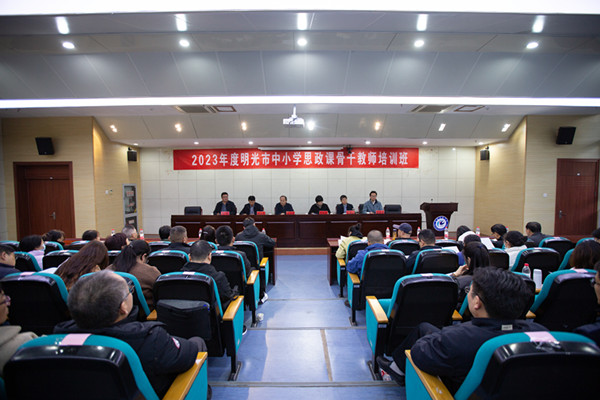 开班式由马克思主义学院党总支书记杨仕勇主持,学院党总支副书记、院长张德化,明光市委教体工委副书记姚红杏先后致辞。教育部大中小学思政课一体化建设共同体(江苏)特约研究员,江苏省淮阴中学德育处主任高新民、合肥市中学思政教研员,省大中小学思政课一体化建设指导委员会专家指导组副组长侯新旺、省政协教科卫体委员会副主任,省大中小学思政课一体化指导委员会主任刘新跃等分别作了题为《以习近平总书记讲话和党的二十大精神为指导,加强大中小学思政课一体化建设》《顶天立地做人积极主动做事——周恩来崇高风范培育时代新人大中小思政课一体化实践探索》《纵横贯通一体推进——构建“大思政”育人新格局》的主旨报告,并就参训教师提出的相关问题展开了深入的交流与研讨。