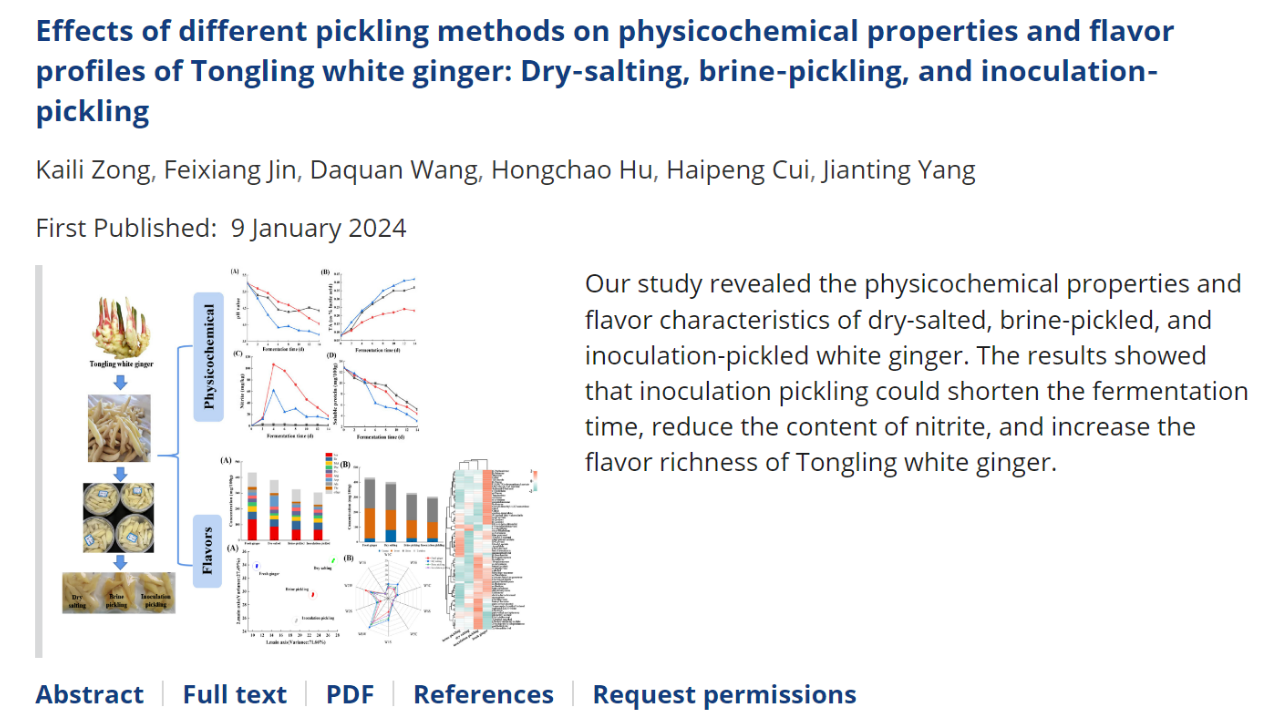 1月9日,我校果蔬精深加工与营养控制创新团队在农林科学领域二区期刊Food Science & Nutrition(IF=3.90)在线发表题为“Effects of different pickling methods on physicochemical properties and flavor profiles of Tongling white ginger: Dry‐salting, brine‐pickling, and inoculation‐pickling”的研究论文。我校食品工程学院2021级食品加工与安全领域研究生纵凯莉为第一作者,杨剑婷副教授为通讯作者,乐动网页版登录入口_乐动网页版(中国)为唯一完成单位。