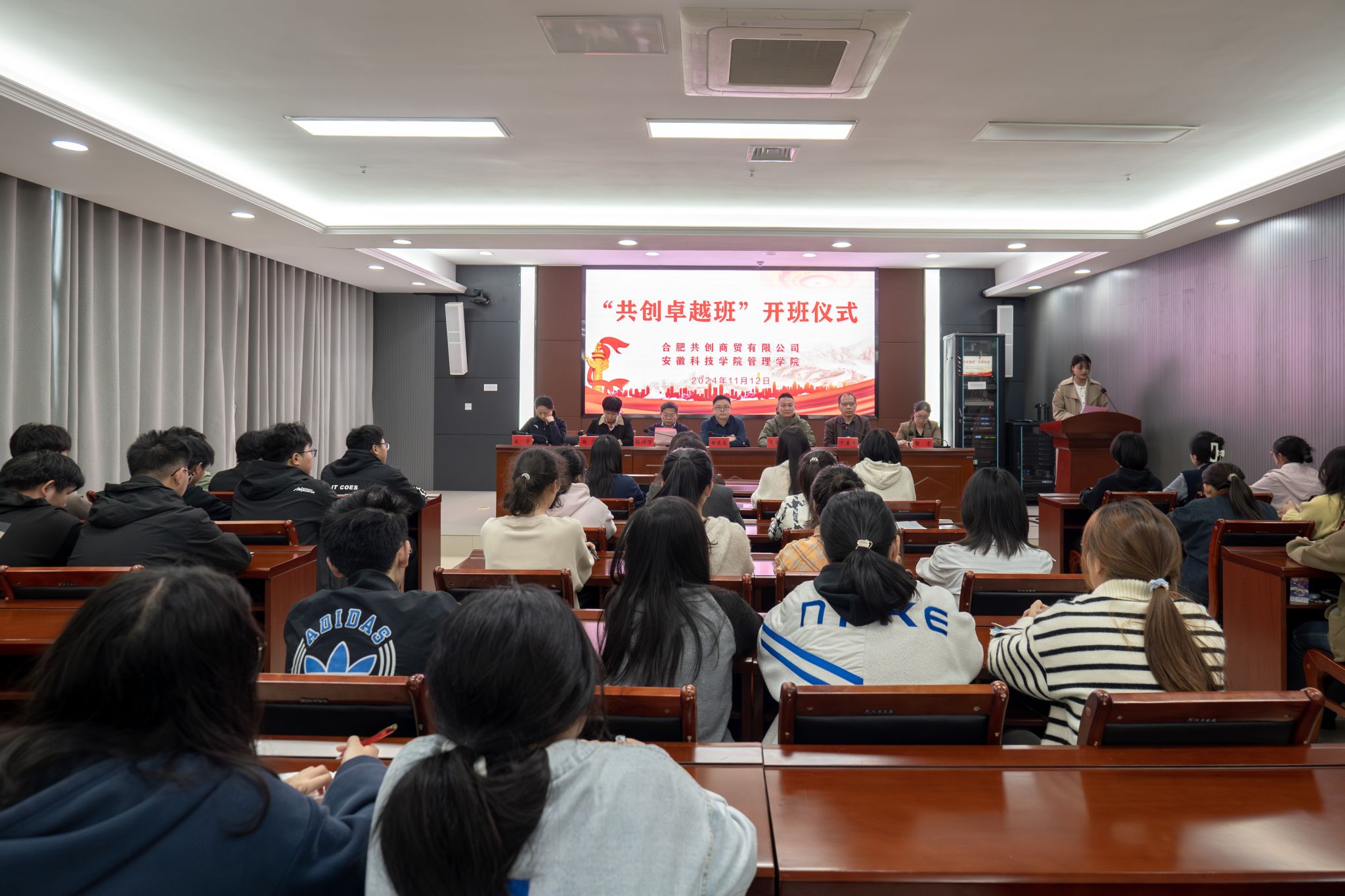 11月12日下午,我校与合肥共创商贸有限公司(安踏安徽总代理商)联合举办的“共创卓越班”开班仪式在龙湖校区西辅楼111会议室如期举行。教务处副处长(主持工作)舒英杰,合肥共创商贸有限公司常务副总经理范中山、合肥共创商贸有限公司人力资源总监郭震、合肥共创商贸有限公司人力资源经理王芳,管理学院党政领导和全体卓越班同学出席了开班仪式。开班仪式由管理学院党委书记丁景良主持。