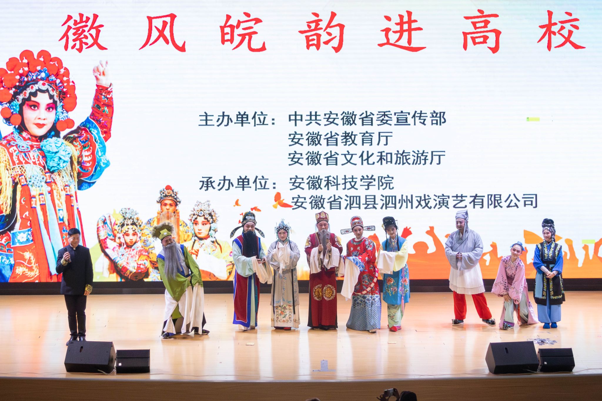 11月25日,由中共安徽省委宣传部、安徽省教育厅、安徽省文化和旅游厅联合主办的2025年“校园大舞台—徽风皖韵”进校园活动在我校龙湖校区报告厅精彩启幕。党委副书记曹付忠,党委委员、副院长王孝义与300余名师生齐聚一堂,共同欣赏泗县泗州戏非遗传承人带来的经典古装剧目《状元与乞丐》,在传统戏曲的独特魅力中感受文化传承与思政教育的深度融合。