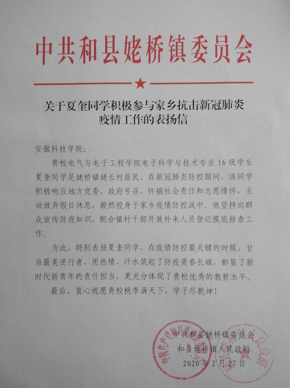 谈到夏奎,村支书夏发平兴奋地说:虽说自己平时走街窜巷,但这段时间工作量也有点让吃不消,没想到夏奎却没说苦与累,从夏奎身上看到了成长起来的年轻人身上的一种责任担当。2月27日,中共和县姥桥镇委员会致函乐动网页版登录入口_乐动网页版(中国)表扬夏奎在疫情防控关键的时候,甘当最美逆行者。