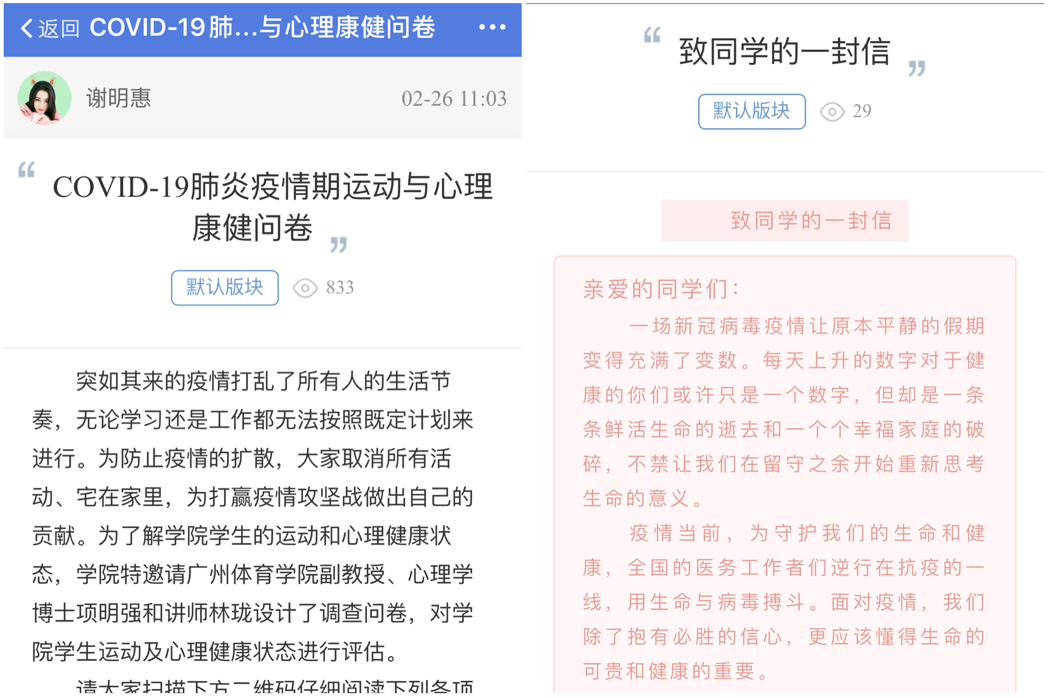 2月26日,为及时了解学院学生的生活情况和心理状态,落实思想意识的动态管理,学院分团委书记张炎在易班平台致广大同学一封信:疫情当下,青年大学生从中懂得生命的可贵,不断地与病毒相抗衡,用行动守护奋战在前线的勇士们!同时,在学院党总支副书记何俊如的特邀下,广州体育学院副教授、心理学博士项明强和讲师林珑针对学院学生运动及心理健康状态设计了调查问卷,旨在掌握学生居家身体锻炼和心理状态情况,并提高学生居家锻炼意识,确保学生强健体魄和健康心理。
