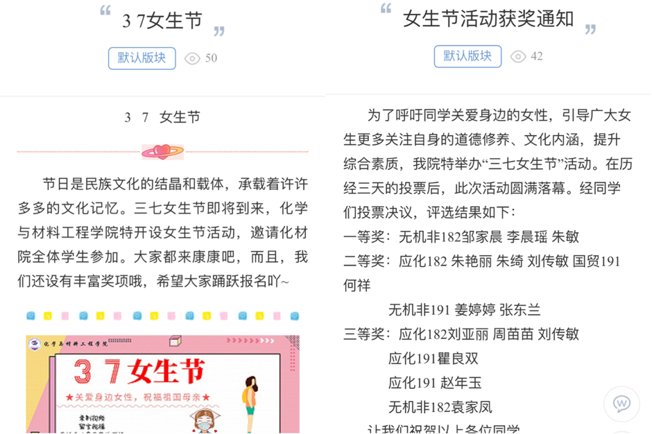 生命可贵,亦有如画般精彩,疫情的肆虐也阻挡不了女生节斑斓的色彩,“3 7女生节”如期举办。学生们积极参与活动,在易班平台上传自己与身边女性日常生活的视频与图片,并在留言区为祖国母亲送上了自己最诚挚的祝福。同时呼吁学生关爱身边女性,引导广大女生关注自身道德修养与文化内涵。