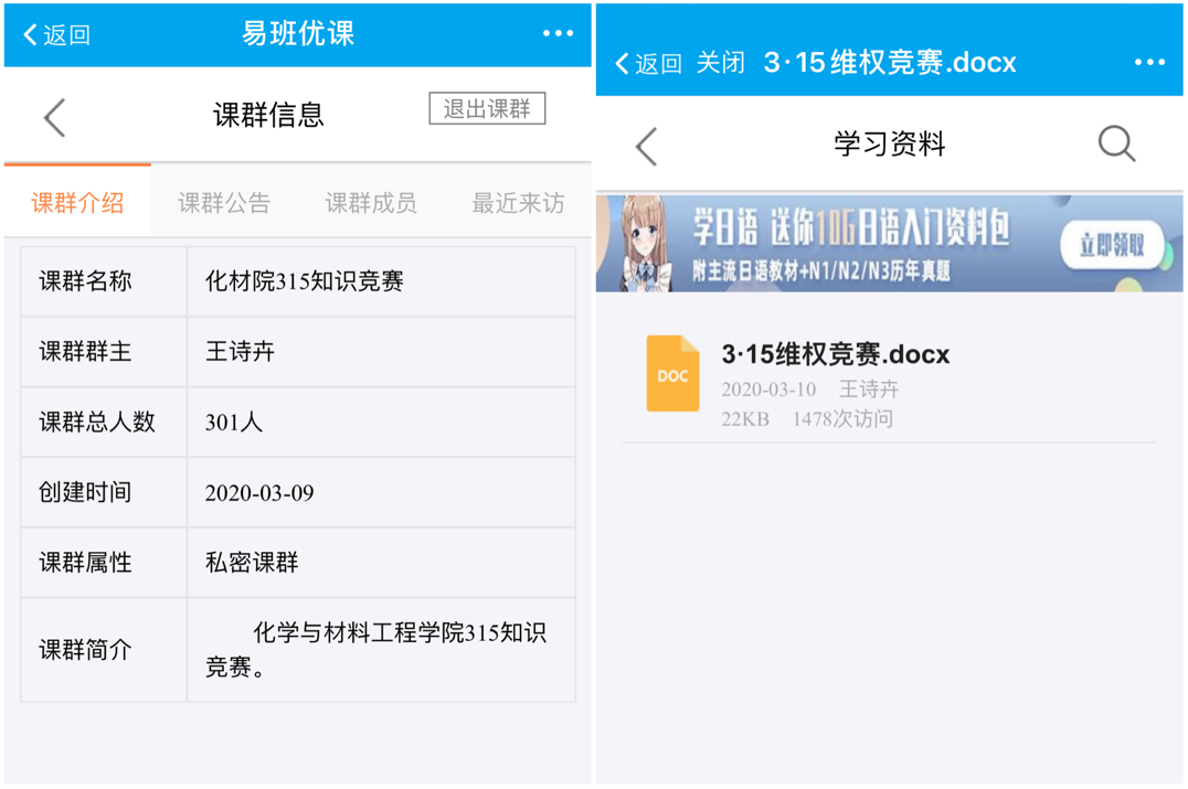 3月15日,为提高学生消费安全意识,值此消费者权益日来临之际,学院在易班优课创办了“3 15维权知识竞赛”,线上学习使得学生们更加便捷、独立自主的透析维权知识的相关内容,参学者通过在优课课群进行学习后,完成相应的维权知识竞答,以此来了解自身对维权知识的掌握情况。