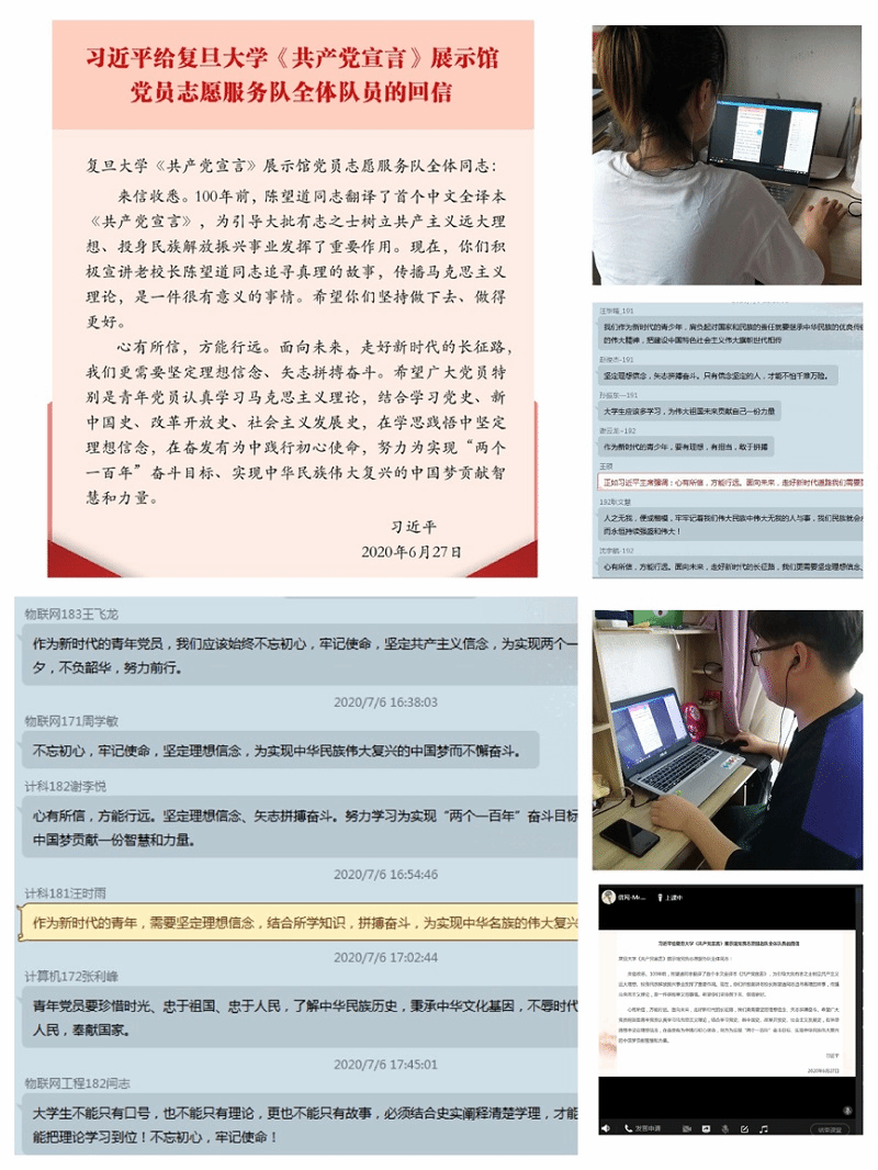 “心有所信,方能远行。”近日,习近平总书记给复旦大学《共产党宣言》展示馆党员志愿服务队全体队员的回信再次引发了广大青年学子的热烈反响。7月3日至7日,信息与网络工程学院各团支部以“悟回信精神 行远志更坚”为主题,通过易班、QQ群、微信群等形式相聚“云”端,认真学习了习近平总书记的回信原文,感悟新时代中国青年的信仰与奋斗。