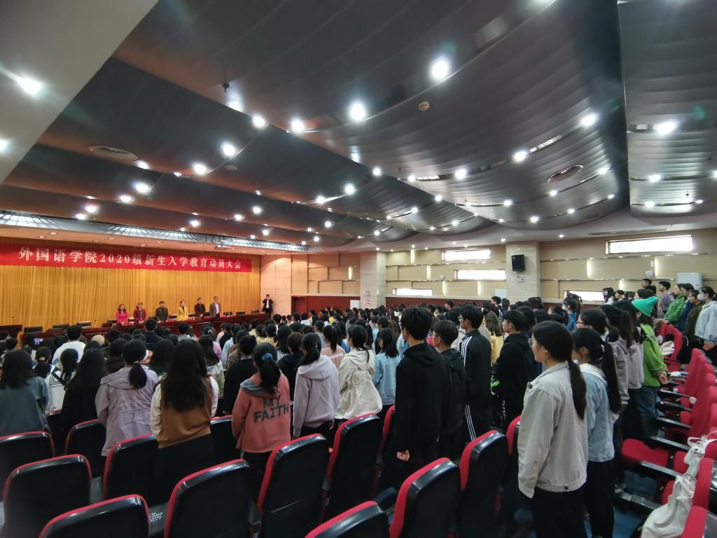 丹桂飘香,金秋送爽。20级新生带着青春的活力,带着对知识的不懈追求,带着对大学校园生活的无限憧憬,迈进了乐动网页版登录入口_乐动网页版(中国)外国语学院。为了让新生更快适应新环境,适应新的生活,顺利、平稳、有效地进入大学生活。10月21日下午14:00,外国语学院在新图书馆第二报告厅举行了新生入学教育动员大会。外国语学院院长陈德用、党总支书记蔡为青、副院长刘萍、教学秘书周海平、英语专业教研室主任兼英语专业负责人洪民老师、翻译专业教研室主任兼翻译专业负责人邓兆红老师、分团委书记陈慧中、专职辅导员宋兵兵,学院教师代表,全体20级新生参会,大会由刘萍主持。