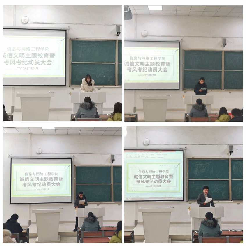 为进一步提高大学生的诚信文明素养,加强考风考纪教育,12月30中午,信息与网络工程学院于致知楼A111召开诚信文明主题教育暨考风考纪动员大会。学院副处级辅导员韦乃学,专职辅导员王培培、陈凯、李军成、崔北坤以及20级各班学生干部参加会议,会议由王培培主持。