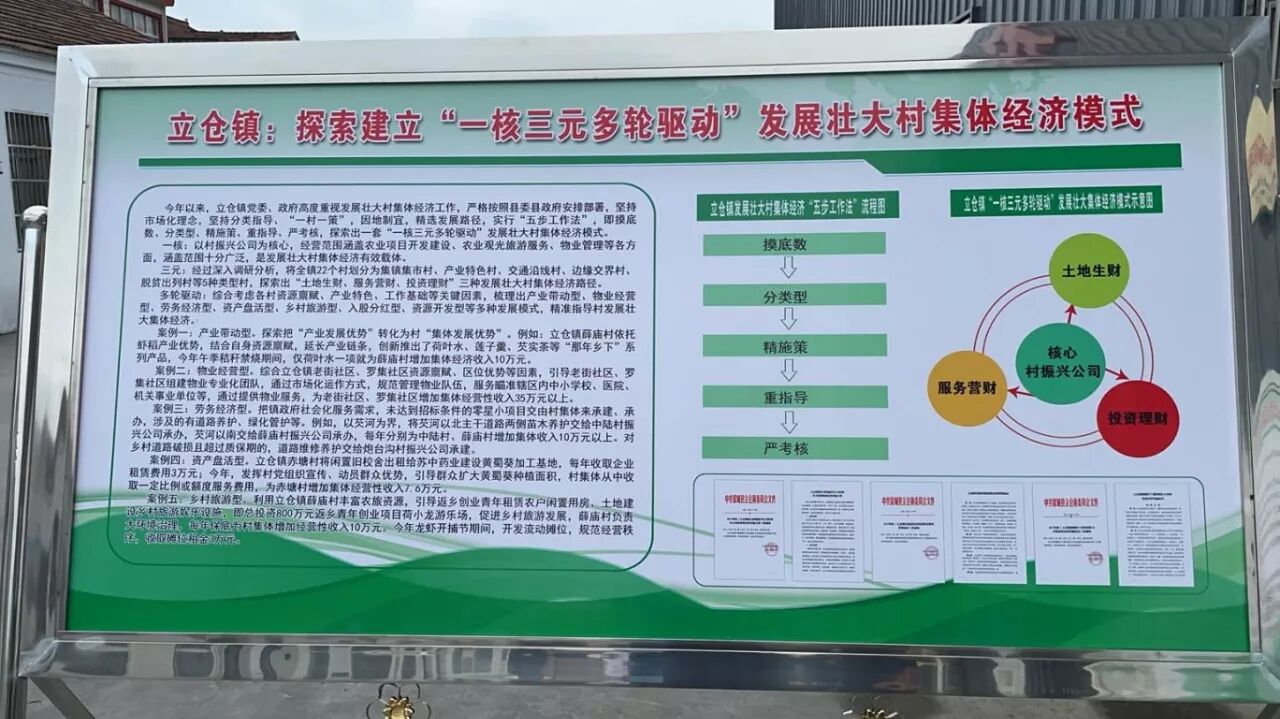 在走访期间,实践团队前往蒙城县立仓镇参观“那年·乡下”芡河现代农业示范园。整个园区建设在立仓芡河北岸,以农旅为核心,占地面积约7700亩,自然资源优势明显,水系资源丰富,为全面促进农旅产业融合夯实了基础。得知团队成员此次走访的目的,园中的工作人员热情地向成员们介绍了立仓镇探索建立的“一核三元多轮驱动” 发展壮大村集体经济模式。该模式以乡村振兴公司为核心经过深入调研分析,将全镇22个村按照地理位置、乡村特色等探索出“土地生财、服务营财、投资理财”三种发展壮大村集体经济路径,构建人与自然和谐共生的乡村发展新格局。为深入调研乡村振兴建设成果,团队成员走进立仓镇黎明村。2016年以前,黎明村内涝、水灾严重,一个不到6000人的村就有五保户74人,残疾人192人。近几年,随着脱贫攻坚战的全面胜利,黎明村迎来了乡村振兴建设,政府推动完善基础设施建设,实现水泥路村村通,当年的低洼地变成旱能灌、涝能排的聚宝盆。黎明村成为立仓镇生态建设与文化建设一体推进的现实写照。据当地村民介绍,以前的黎明村由于水灾严重,传统种植作物连年歉收,村民生活贫困。后来当地政府经过不断探索研究,进行了产业调整,充分利用地势低洼水源充足的优势,带领村民养殖小龙虾、种植生态水稻等,实现了一水多用、一地多收,当地群众也成功脱贫致富。