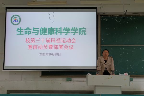 在我校第三十届田径运动会即将到来之际,为充分调动学院运动员的积极性,保证运动会期间各项工作有序进行,10月28日中午,生命与健康科学学院于新知楼B304教室召开校第三十届田径运动会赛前动员暨部署会。学院党委副书记彭丽萍、团委副书记姜毅出席本次会议。全体参赛运动员,20、21级各班班长、体育委员及学生会全体成员到场参加会议,会议由学生会主席胡康主持。
