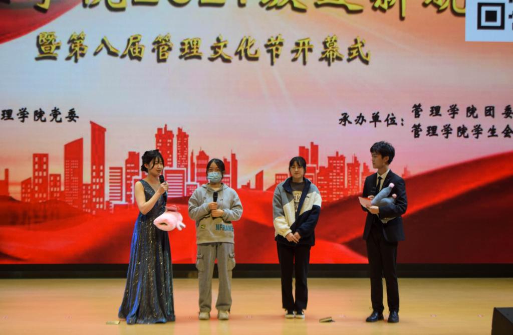 11月20日晚,管理学院在龙湖校区东辅楼报告厅举行2021年“百年风华心向党,牢记使命迎新程”迎新晚会暨第八届管理文化节开幕式。党委书记丁景良,党委副书记、纪委书记陶漫,党政办公室主任李永鹏,团委副书记方辛、江旭聪,专职辅导员黄斐、姚姝媛,物流教研室教师武士文应邀出席晚会暨开幕式。龙湖校区各学院学生会及部分学生组织负责人、管理学院全体2021级新生也应邀观看晚会。