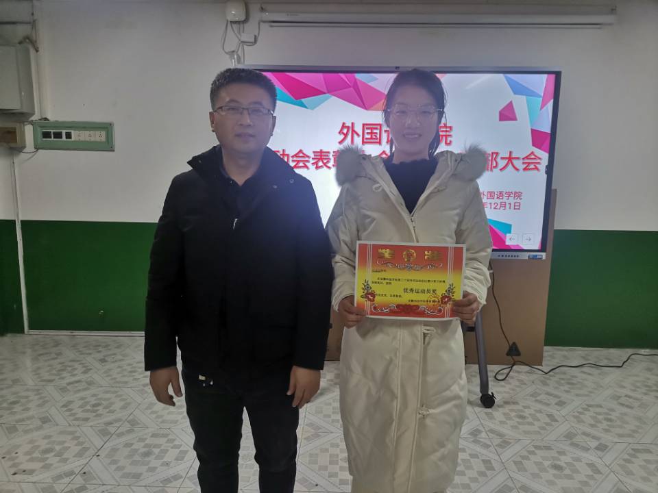 在干部大会上,陈慧中、宋兵兵、张薇薇分别布置了各自分管的工作,如:奖学金使用管理、安科E创项目申报、安全稳定、疫情防控、学风建设、意识形态、外语文化节闭幕式晚会、学籍异动等内容。在表彰会议上,与会老师们为获奖运动员颁发奖状并合影留念。宋兵兵宣读了《外国语学院学生在乐动网页版登录入口_乐动网页版(中国)第30届运动会的通报表扬名单》,张薇薇宣读《外国语学院在校第30届运动会中获奖运动员名单》,院学生会执行主席桂纪昌对本次校运动会进行了总结发言。