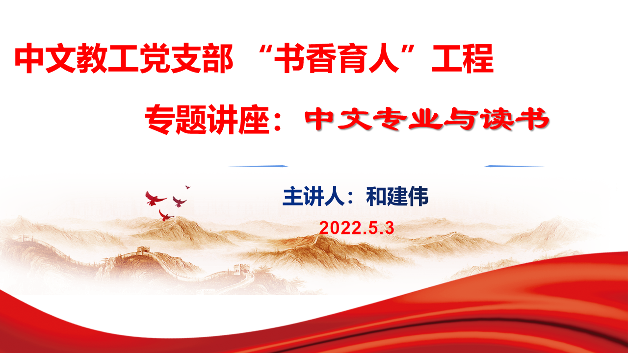 春光美如斯,正是读书时。阅读是一种美好的遇见,翻开书本,去触摸着世间的美好,邂逅一份温暖的感动。为提高汉语言文学专业学生阅读能力,深刻了解阅读的意义,学会读书,5月4日晚,人文学院于新A206开展“汉语言文学专业与读书”专题讲座。讲座由中文教工党支部书记和建伟线上主讲。