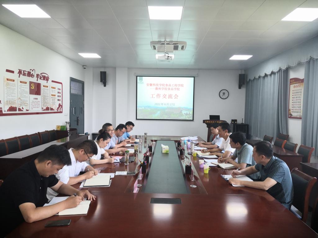 6月17日,食品工程学院党委书记付光玺带领院党委副书记王广良、食品工程系教工党支部书记兼食工系主任郑海波、食品质量与安全专业负责人丁志刚、党政办副主任杨勇一行,赴滁州学院生物与食品工程学院开展党建合作,考察交流学科和专业建设、专业认证典型经验并进行了硕士研究生招生宣传。滁州学院生物与食品工程学院党委书记叶高、副院长孙星、食品工程系主任于士军、食品安全系主任刘洋、党委秘书张元昶、党政办主任陈志宏参加。