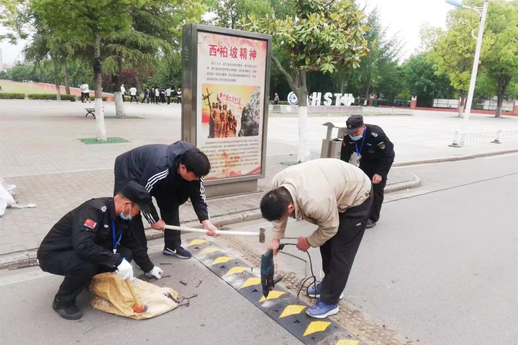 切实抓好整改。对本次大排查大整治行动排查出的风险隐患,保卫处实行清单管理。建立安全隐患排查整治台账,对账销号。坚持“立行立改、边查边改”,对能够立即整改到位的问题,第一时间整改结束,如排查中发现有些路段减速带松动,支部党员干部带头抡大锤,仅两天就更换了9条总长达57米的减速带;对暂时难以完成整改的问题,也明确整改时限,限期完成整改任务,如凤阳校区新图书馆消防系统年久损坏,消防安全隐患大,保卫处已制定维修改造方案,正在走招标采购相关程序。