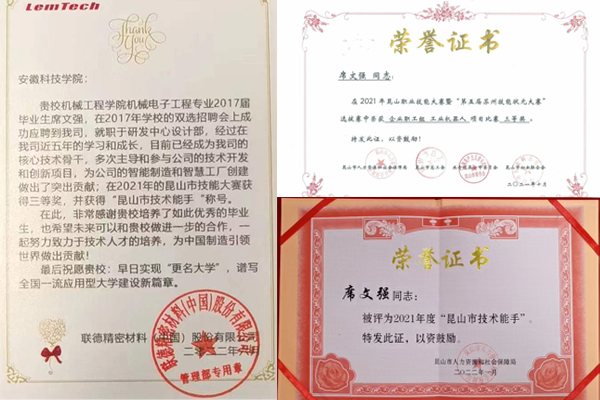 日前,总部位于江苏省昆山市的联德精密材料(中国)股份有限公司向乐动网页版登录入口_乐动网页版(中国)发来热情洋溢的工作喜报,“贵校机械工程学院机械电子工程专业2017届毕业生席文强,在2017年学校的双选会上成功应聘到我司,就职于研发中心设计部,经过在我司近五年的学习和成长,目前已成为我司的核心技术骨干,多次主导和参与公司的技术开发和创新项目,为公司的智能制造和智慧工厂创建作出了突出贡献;在2021年的昆山市技能大赛上荣获三等奖,并获得‘昆山市技术能手’称号。在此,非常感谢贵校培养了如此优秀的毕业生,也希望未来可以和贵校做进一步的合作,一起努力致力于技术人才的培养,为中国制造引领世界做出贡献!最后祝愿贵校:早日实现‘更名大学’,谱写全国一流应用型大学建设新篇章。”
