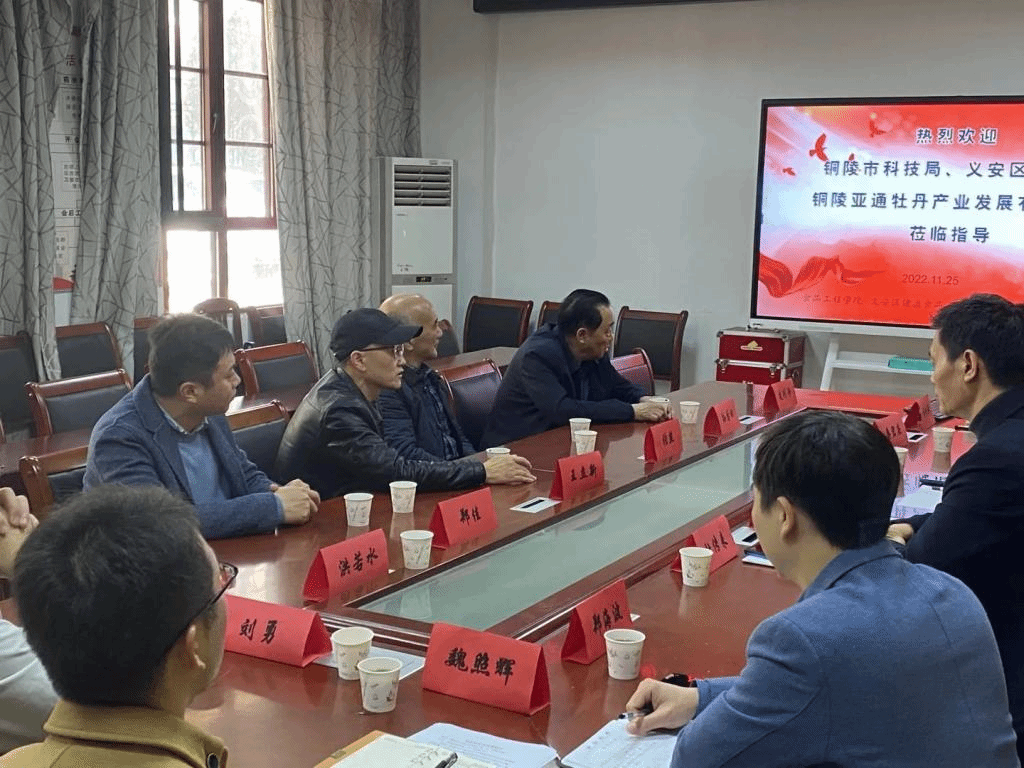 为进一步深化校企合作,提升产教融合,实现优势互补,结合省级科技特派团工作指导,11月25日,铜陵市科技局调研员张燕、义安区科技局副局长王立新、义安区科技局农村与社会发展科科长郑佳、铜陵亚通牡丹产业发展有限公司董事长孙后田一行赴我校食品工程学院进行交流指导,食品工程学院党委书记付光玺、副院长翟立公、副院长郑海波、研究生党支部书记桑宏庆、义安区健康食品产业(凤丹)科技特派团”团长杨剑婷及团员魏照辉、刘勇等相关老师热情接待并进行交流座谈,双方随后隆重举行义安区健康食品产业(凤丹)科技特派团签约及揭牌仪式。