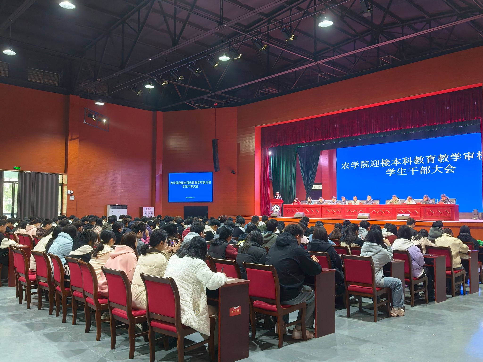 为增进广大学生干部对学校和学院重点工作的了解,熟悉对学生的相关要求,全力做好本科教育教学审核评估等重点工作,进一步加强学生干部队伍建设,提高学生干部素质能力, 3月24日上午农学院在大学生活动中心召开迎接本科教育教学审核评估学生干部大会。农学院党政领导、全体辅导员,团委、学生会等学生组织,各本科和研究生班级主要学生干部等参加会议,会议由农学院党委副书记张轶辉主持。