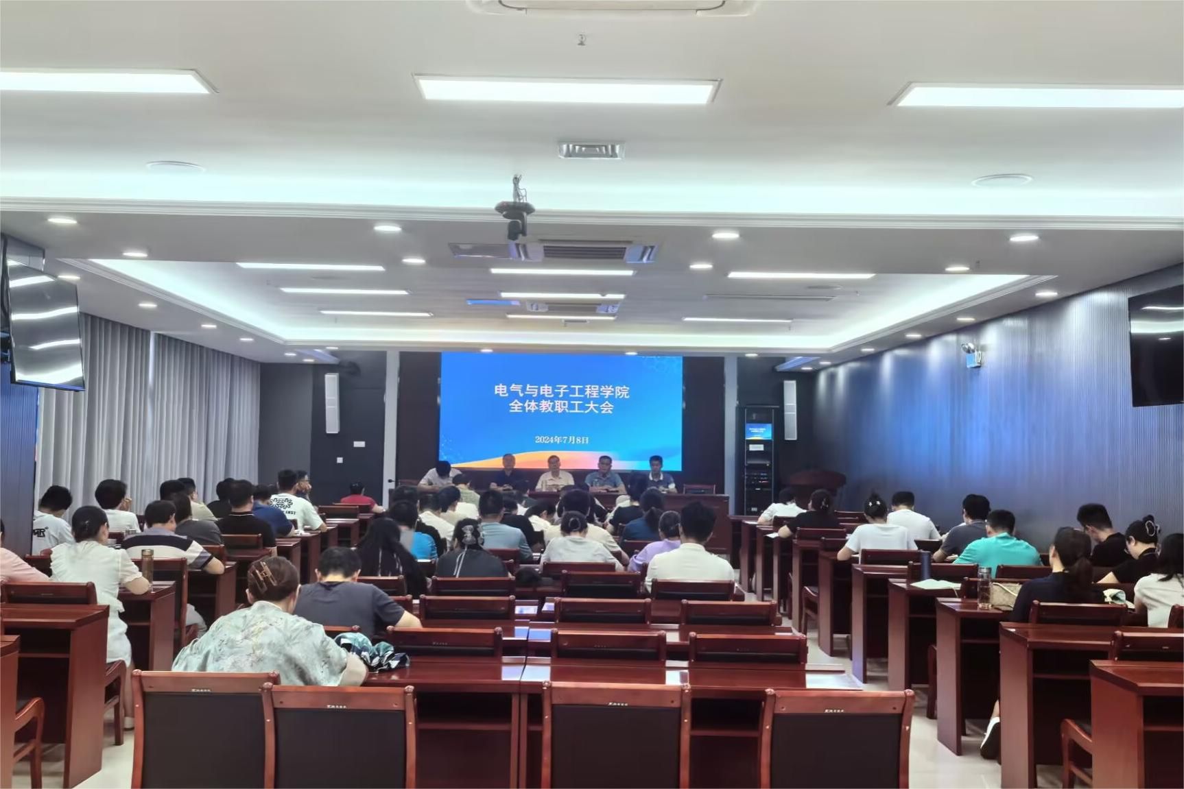 7月8日上午,电气与电子工程学院在西辅楼111会议室召开全体教职工大会,学院党政领导班子、全体教职工参加会议,会议由学院党委书记骆海邦主持。