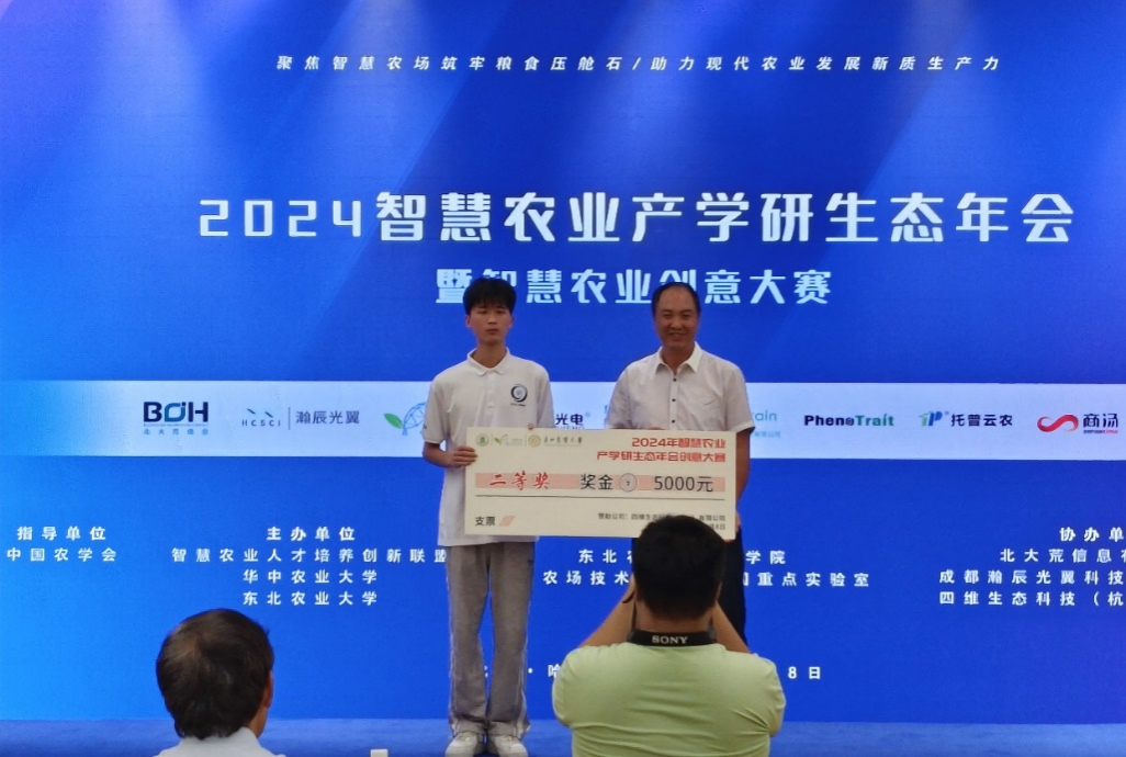 赛项三:"2024年中国智慧农业创意大赛"于2024年8月在东北农业大学举行。大赛以“聚焦种业科技创新,牢筑现代种业根基”为题,旨在加强数字乡村建设,构建农业农村大数据体系,推动新一代信息技术与农业生产经营深度融合,加快实现农民富、农业强、农村美,助力乡村全面振兴,同时实现智慧农业交叉学科人才培养。决赛中与中国农业大学、东北农业大学、中国科学院大学等多所高校代表队同台竞技。经过激烈角逐,ITIE实验室李世鹏同学负责的项目,在教务处副处长高青海教授和信息与网络工程学院院长余宏杰教授共同指导下荣获全国二等奖。
