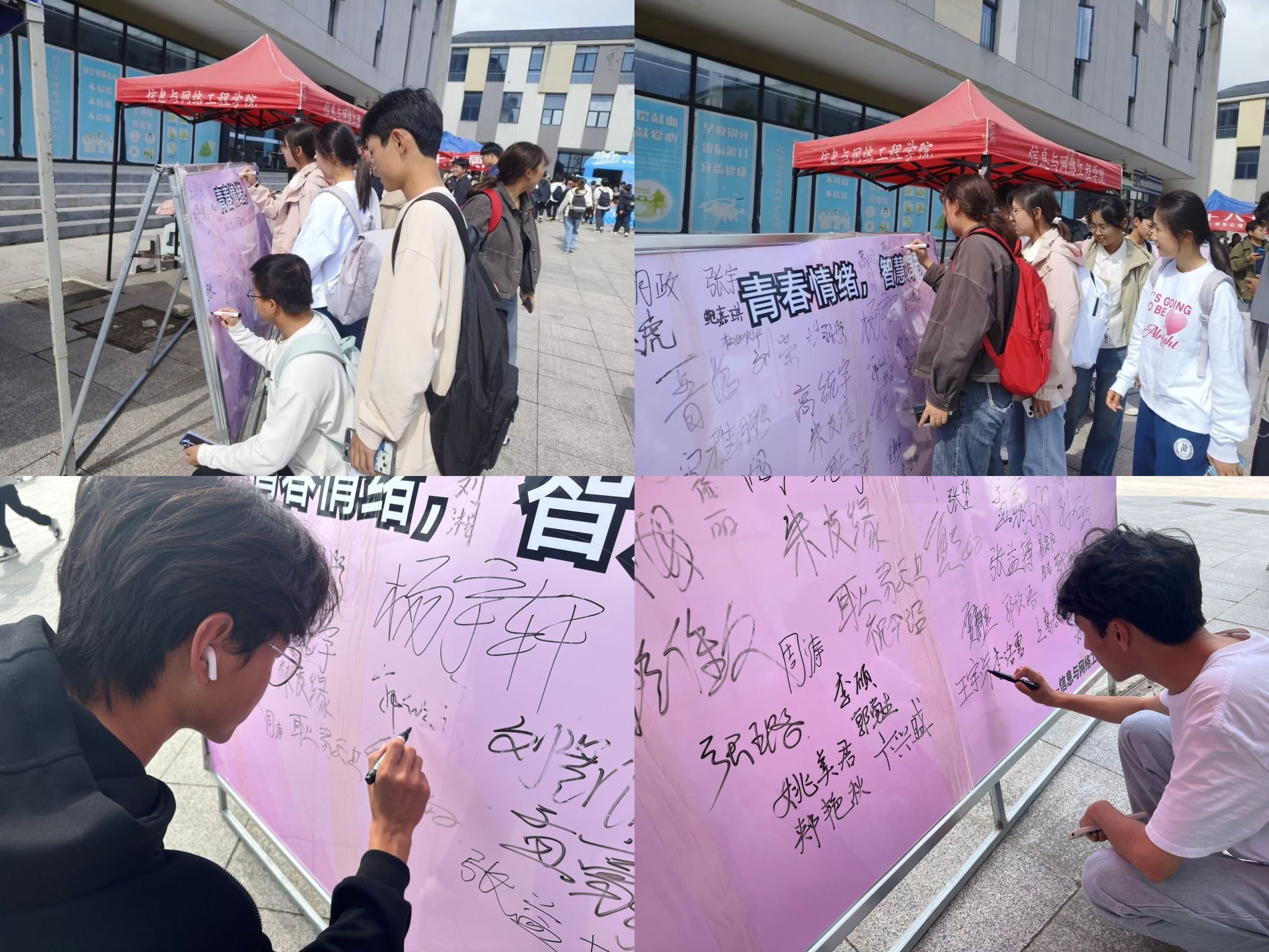 10月16日,为广泛宣传普及心理知识,信息与网络工程学院心联在龙湖校区众创空间东侧广场进行了以“新旅程,心同行”为主题的展板宣传活动,并进行了以“青春情绪,智慧调节”为主题的签名活动。活动现场,同学们纷纷参与其中,积极学习心理健康知识,了解心理健康对大学生活的重要性,帮助大学生更好更快地适应新生活。
