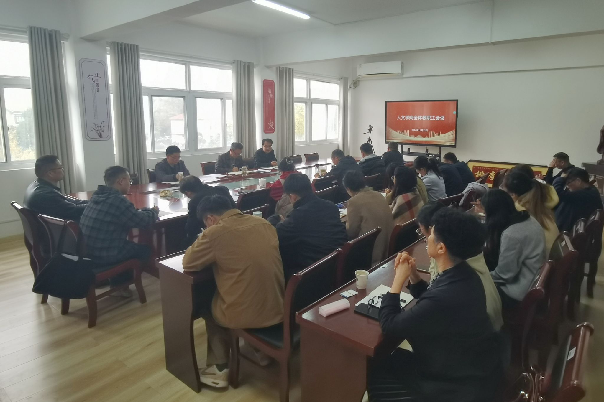 11月13日下午,人文学院在学院会议室召开2024年秋季学期期中全体教职工大会,总结和部署学院重点工作,传达关于做好学校第四次党代会相关工作通知精神,部署开展相关专项整治等工作。会议由学院党委副书记、院长李晓东主持。