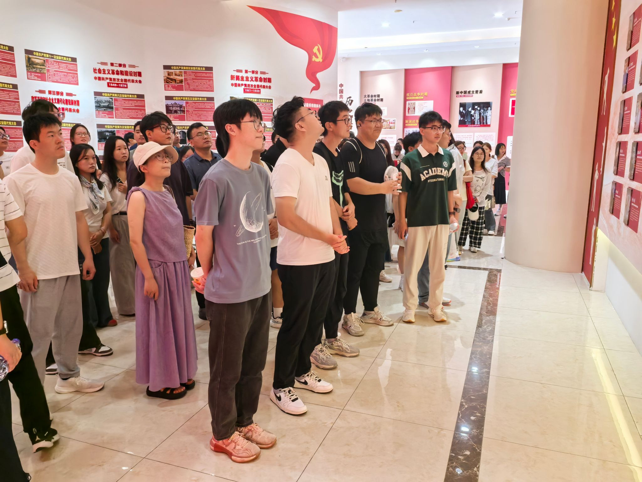 下午,研学团队在蚌埠禾泉小镇红色教育基地开展沉浸式党史学习。在党史展示区,场馆讲解员结合历史图片、文献资料与复原场景,按新民主主义革命时期至中国特色社会主义新时代的时间脉络,讲解党带领人民奋进的百年历程,重点解读不同阶段党在经济、生态、民生领域的决策成果。研究生们认真聆听记录,部分同学表示此次研学拉近了书本与现实的距离,深刻感悟到党的初心与领导力,未来将把所学融入学术与实践。此次跨学院研学,既打破学科壁垒、整合教育资源,更以 “行走的党课” 创新研究生思政教育路径,为培养时代新人筑牢基础。(特约通讯员:王华雪 摄影:慕雨浩 审核:沈树周 编辑:李锦)