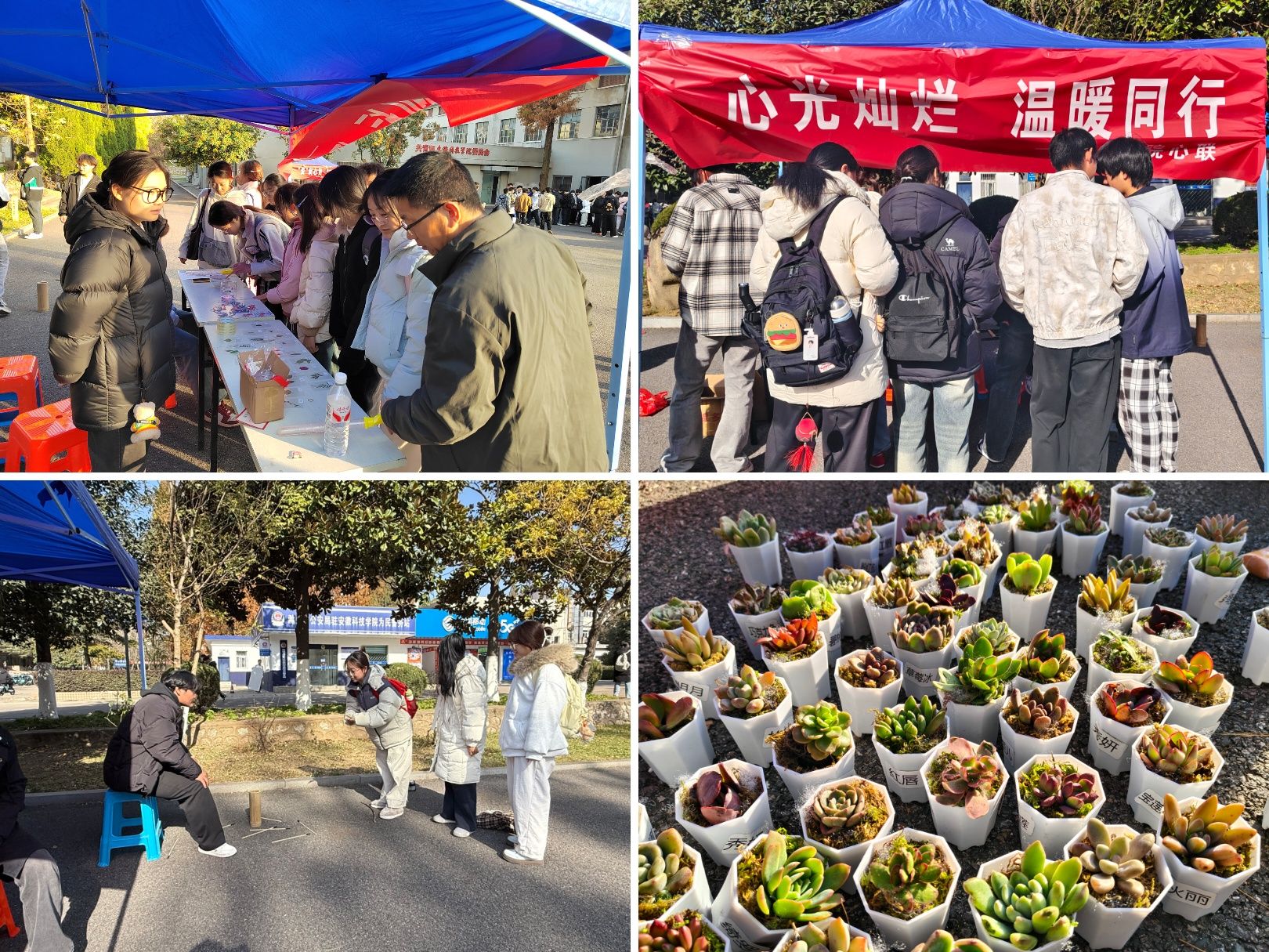 11月26日,农学院举办以“心光灿烂,温暖同行”为主题的心理游园会。活动吸引众多师生参与,现场热闹非凡。游园会设置多项特色活动,“夹豆子”锻炼专注力与耐心,投壶、套圈活动也人气颇高。活动结束后,参与者获树叶书签、多肉、胸针等小礼品。