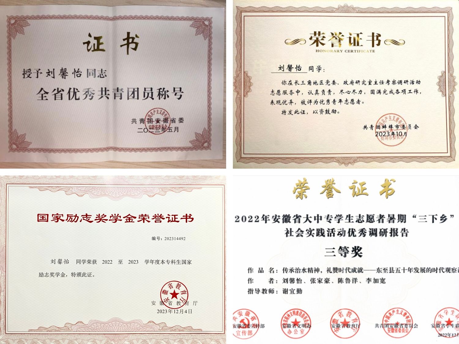刘馨怡,女,中共预备党员,安徽池州人。建筑学院2020级城乡规划专业学生,现任城乡规划202班团支书,曾任校史校情讲解团副团长,国家励志奖学金获得者;荣获安徽省优秀共青团员、暑期社会实践“三下乡”活动“先进个人”,校优秀学生干部等荣誉。