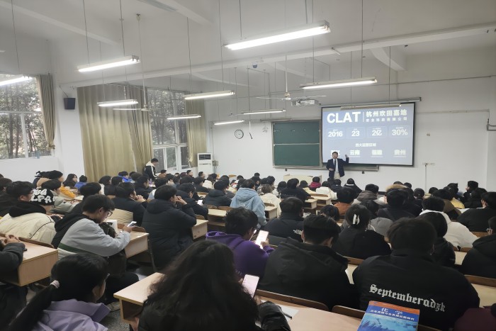 2023年12月27日下午,杭州欢田喜地农业科技有限公司校友携手乐动网页版登录入口_乐动网页版(中国)农学院共同举办的大学生就业指导宣讲会在求知楼A107教室顺利召开。参会人数达130余人,本次会议由农学院党委副书记张轶辉主持,杭州欢田喜地农业科技有限公司2017级植保、农学优秀毕业生韩璞、张祥主讲。