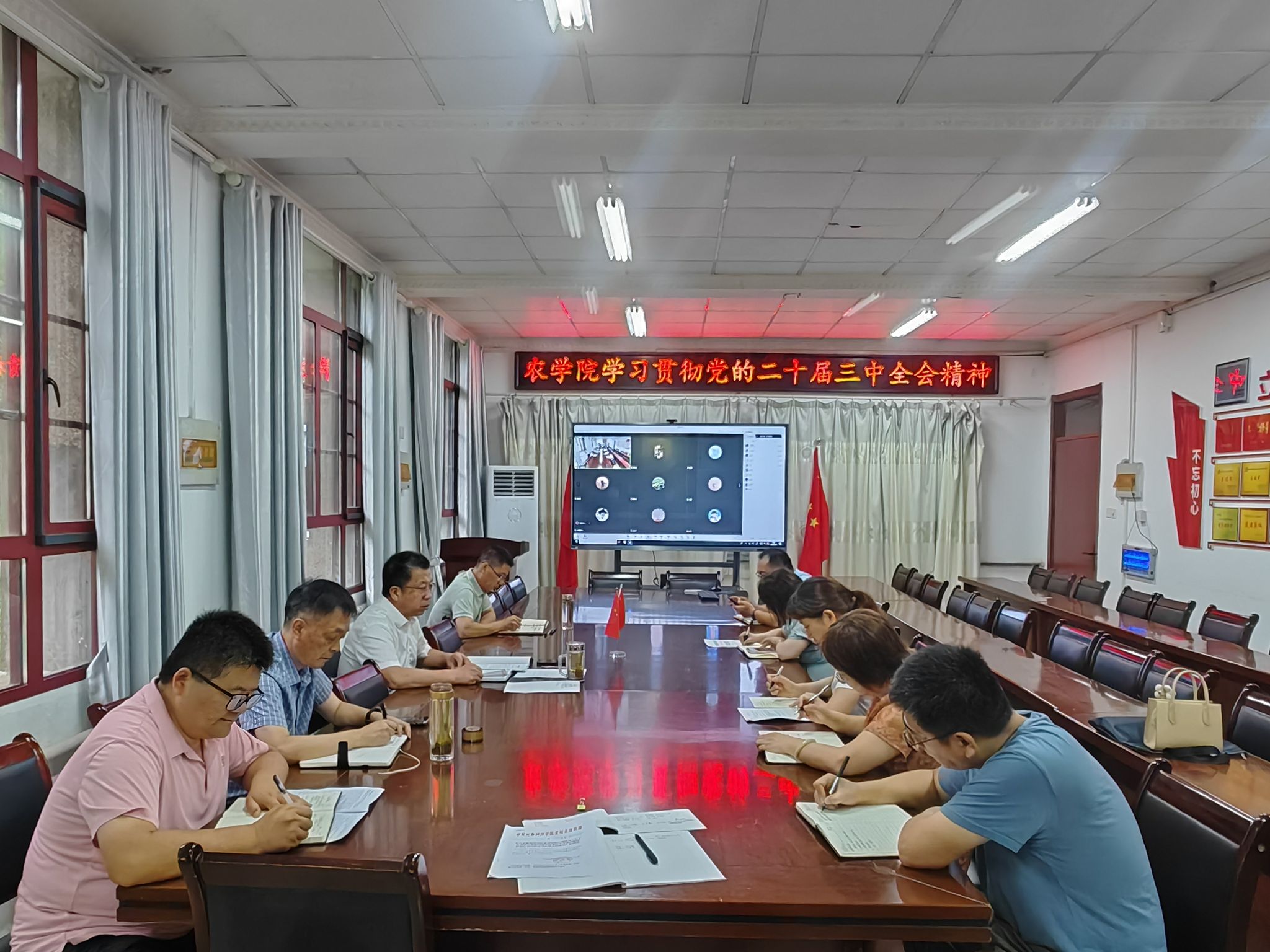 7月27日上午,农学院党委在学院会议室以线上线下相结合方式召开学院理论学习中心组扩大会,专题传达学习党的二十届三中全会精神,并就如何贯彻落实做出进一步安排。学院党委委员,纪委委员,各党支部书记、副书记,工会主席,团委书记和组织员参加会议,会议由党委书记何世潮主持。
