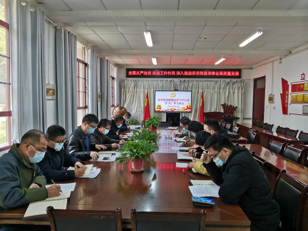 4月1日上午,农学院在学院会议室召开党委理论学习中心组(扩大)会议,本次会议主题是“全面从严治党 改进工作作风 深入推进农学院各项事业高质量发展”。农学院党委委员、纪委委员、支部书记、工会主席、各系主任、团委书记、党风党纪监督员、专职组织员等出席会议。根据疫情防控要求,在蚌(外地)同志通过视频方式参加会议。会议由农学院党委书记何世潮主持。