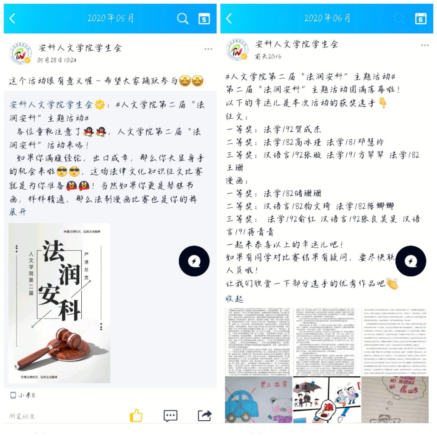 主题活动分为法律文化知识征文比赛和法治漫画比赛两部分,由参赛人员将其作品进行投稿,工作人员将作品上传至易班进行线上投票。活动期间,学生们皆踊跃参加,征文比赛中,选手们皆妙笔生花,以真实的笔触抒发出自己对法律最崇高的敬意,从他们的作品中,可以看出法律对国家、对社会、对个人的重要的作用;漫画比赛中,选手们以精湛的画技,充满寓意的构图,意味深长的配字对自己心中的法律进行了刻画,作品大多以宣传遵纪守法的社会公德为内容。学生们对此次活动十分关注,也积极进行了投票,评选出自己心仪的作品,最终,征文中,法学192贺成杰获得一等奖,法学182高冰瑾、法学181邓慧玲获得二等奖,汉语言文学192张璇、法学191方翠翠、法学182王珊获得三等奖。漫画比赛中,法学182储珊珊获得一等奖,汉语言文学182杨文琦、法学182陈娜娜获得二等奖,法学192俞红、汉语言文学192张良昊旻、汉语言文学191蒋青青获得三等奖。