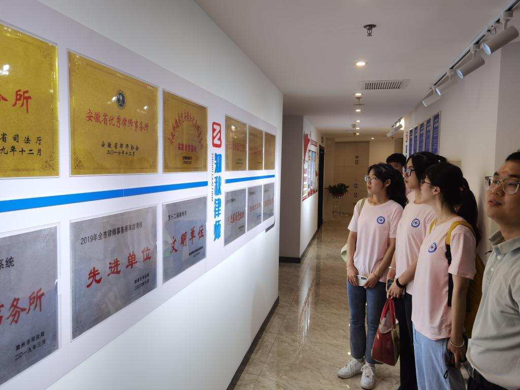 受安徽知秋律师事务所宫鉴主任委托,支伟炜、夏正标两位律师热情接待了来访同学,向同学们介绍了律所基本情况和律所文化、带领同学们参观了知秋荣誉墙,并就同学们感兴趣的经典案例等开展了深入的交流。在学习交流结束后两位律师勉励同学们保持不断前进的动力和耐心,鼓起勇气在法律人的道路上披荆斩棘,不断积累专业知识,为实现心中的梦想而努力奋斗。
