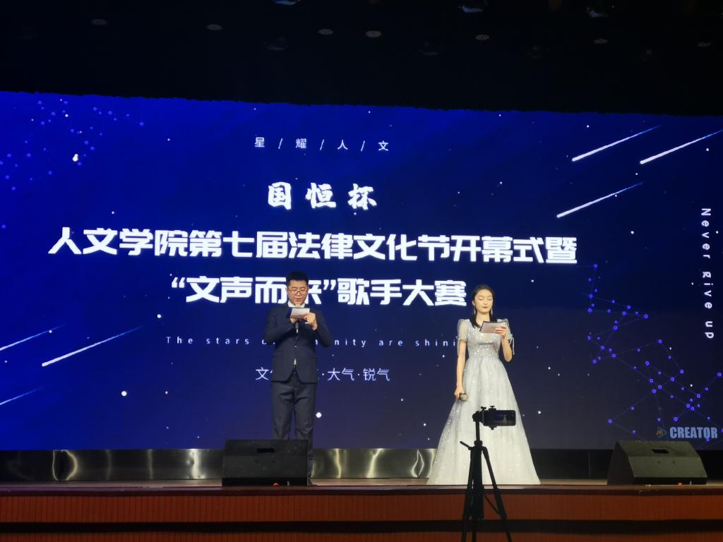 为增强大学生法治意识,激发广大师生自觉维护法律的热情,同时展现人文学子的青春面貌,3月19日晚,人文学院“国恒杯”第七届法律文化节开幕式暨“文声而来”歌手大赛决赛于大学生活动中心隆重举行。人文学院党委书记杜士凤、副院长李晓东、副院长牛永辉、党委副书记李沙娜以及全体辅导员出席本次活动,安徽国恒律师事务所与学院全体师生通过抖音“小文同学”现场直播观看比赛。