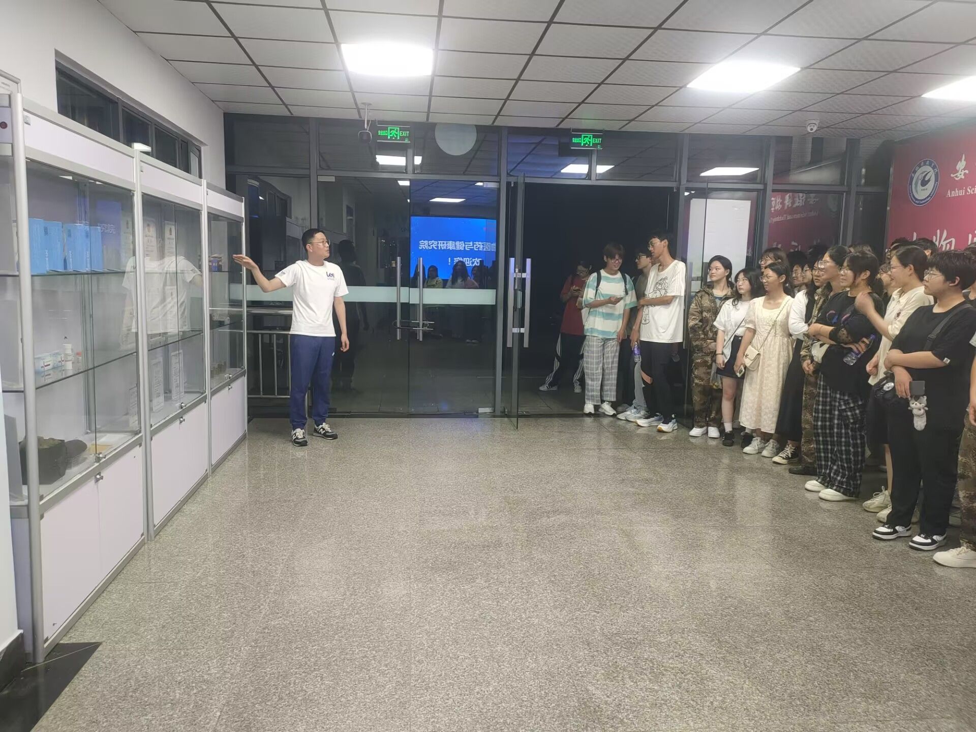 学院2024级新生按照专业分批跟随邱万伟,江琦老师参观生物医药与健康研究院。两位老师向新生介绍了研究院的由来和研究院各层主要功能,并详细介绍了展柜中的各类生物产品,如新冠病毒检测试纸、铁皮石斛、香皂、口红等。还向同学们介绍了原子吸收光谱仪、高分辨透射电子显微镜等大型仪器,并参观了扫描电子显微镜室。在生物传感实验室为新生演示新冠病毒检测试纸,并讲述该实验室的主要功能,在色谱实验室和光谱实验室,他们详细地为新生介绍实验室中的各类器材。参观期间,新生们积极地提出自己的疑问,两位老师耐心地一一为新生答疑解惑。