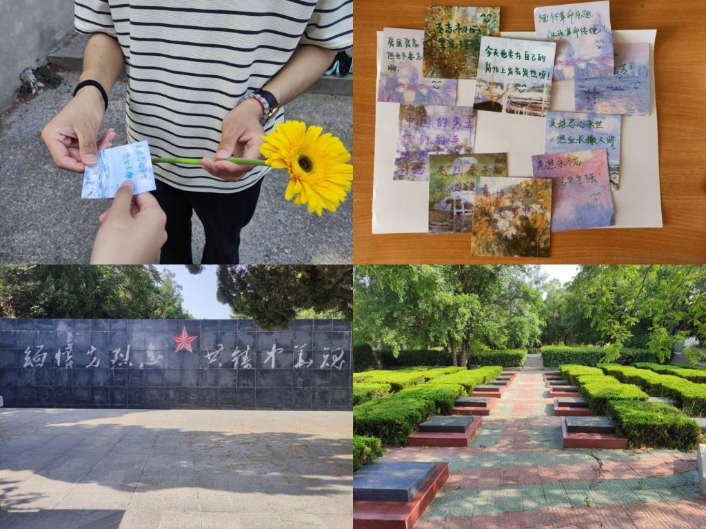 团队成员们怀着崇敬的心情走进烈士陵园,向每一座陵墓鞠躬致敬并献上鲜花。看着纪念碑上的烈士英名录,成员们仿佛看到每一位烈士浴血奋战的身影。成员们通过查阅资料,了解每一个名字背后的故事,他们深知如今的幸福生活来之不易,烈士的名字应该永远被铭记。梅门三烈士的故事也令成员们印象深刻,英雄们宁可放弃生命也不向敌军低头的革命气节值得他们学习。为了让更多人了解英烈故事,成员们向前来祭奠的游客分发写有英烈故事的便利贴,游客可以通过便签学习了解红色故事,以此弘扬红色精神。