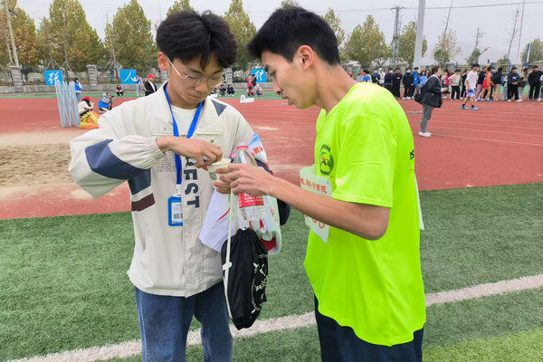 在检录处、跑道旁、缓冲区……总能看到学生联络部成员秦金成的身影,他带领运动员检录、帮助运动员赛前热身、搀扶刚刚结束比赛的运动员离开场地以及向刚结束比赛的运动员递葡萄糖及时补充能量等。他一丝不苟地完成工作,确保运动员顺利完成比赛,在运动员心里,秦金成是他们坚强的后盾,让他们全力以赴为院争光。