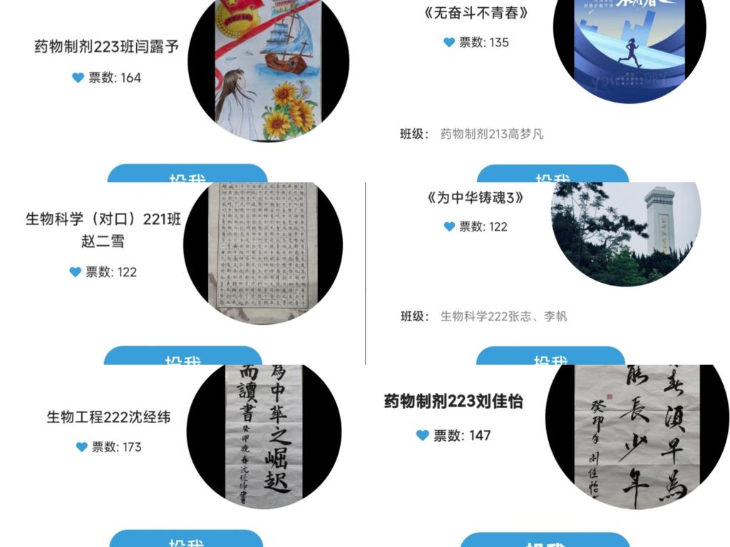 本次活动主要分为摆点宣传、易班线上投票与评委打分三个环节,作品涵盖绘画、书法、摄影、海报四个类别,其中书法分为硬笔组和软笔组两个部分。在前期准备工作就绪后,学院通过宣传鼓励学生积极参加,许多书画爱好者们纷纷踊跃报名,到截止日共收到64幅书画摄影作品。作品内容丰富多彩,紧扣主题,通过作品展现五四青年风貌,讴歌五四运动的历史伟绩,体现五四精神的内涵,展现青年学子的理想追求。征集的绘画作品中,不仅有描绘祖国山河的,有复刻五四运动的,还有临摹爱国英雄的;书法作品中,有流畅飘逸的行草书、古朴俊逸的隶书、苍劲有力的楷书;摄影作品多以校园动态定格为主,鲜艳飘扬的五星红旗、校园的绿荫大道;海报作品中以“五四”展开排版,绘画与文字相结合的方式组合排列。经过最终评定,药物制剂223班闫露予获得绘画组一等奖,生物工程222班沈经纬获得软笔书法组一等奖,生物科学(对口)221班赵二雪获得硬笔书法组一等奖,生物科学(对口)222班张志、李帆《为中华铸魂》获得摄影组一等奖,药物制剂213班高梦凡《无奋斗不青春》获得海报组一等奖。
